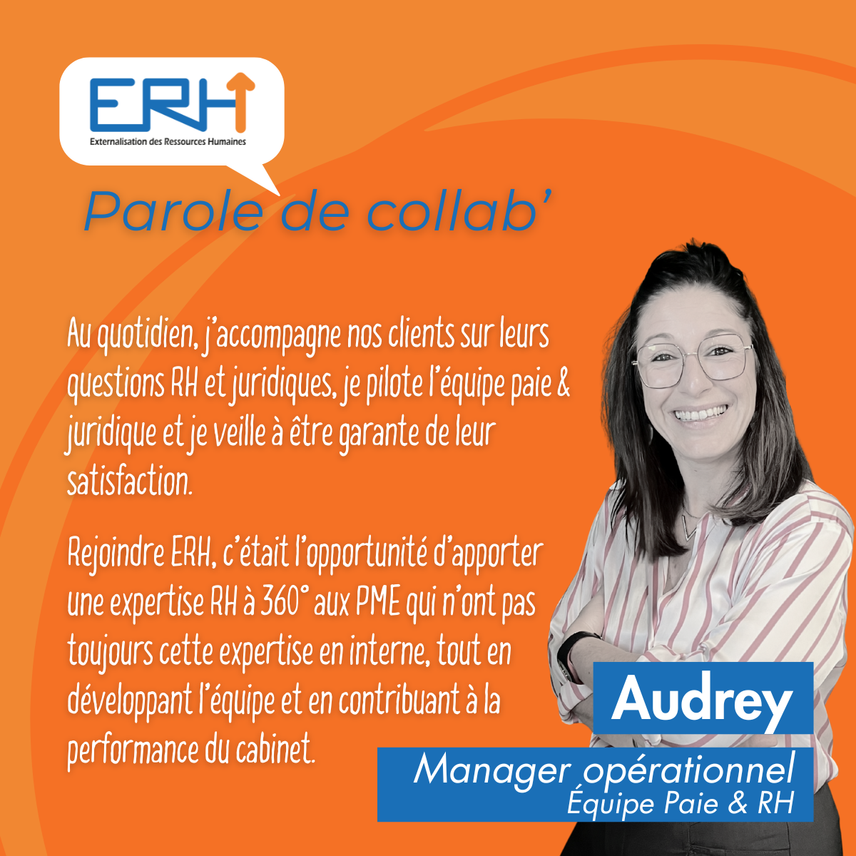Chez ERH, Audrey accompagne nos clients sur leurs enjeux RH et juridiques.